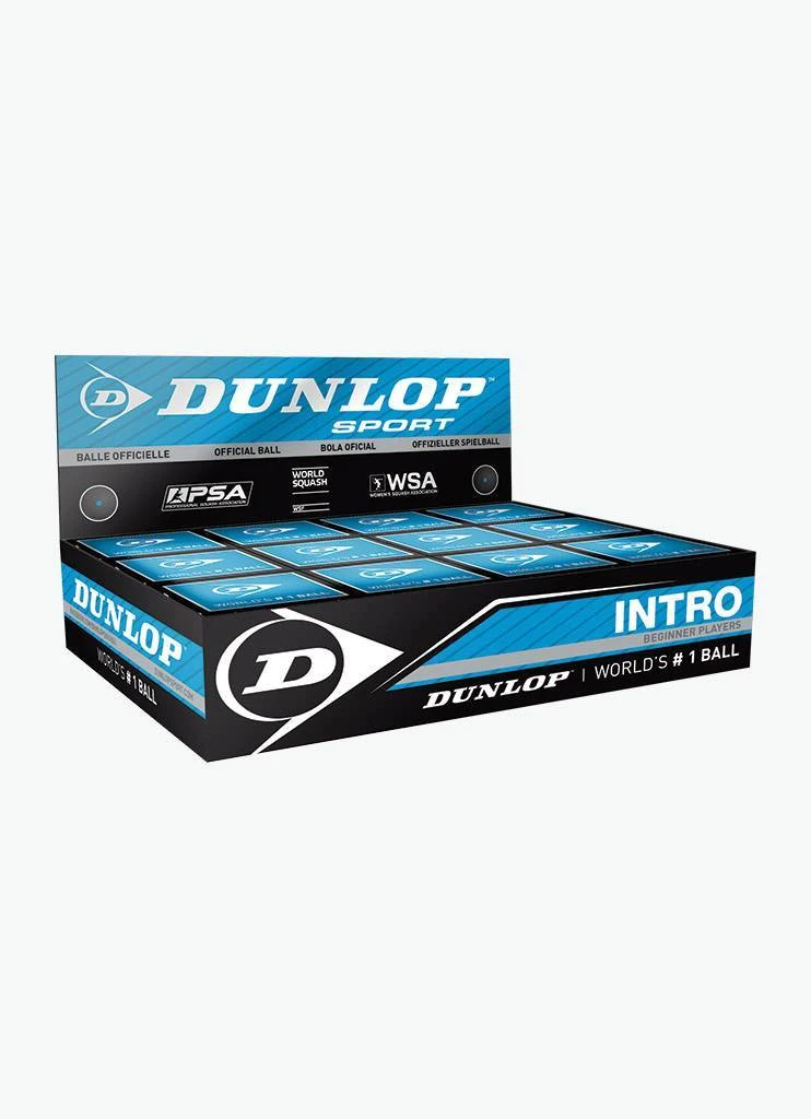 The Dunlop Intro Squash Ball, recognizable by the blue dot, is designed for beginners and juniors because this ball bounces better and does not need to be warmed. The Dunlop Intro Squash Ball is 12% bigger and has 40% more bounce than the official match ball (the Dunlop Pro Squash Ball).
