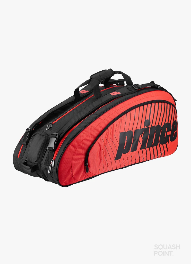 The Prince Tour Challenger 9 Pack has a sporty look and it comes in black colour with red. On both sides the fabric has a playful stripe pattern. The Prince logo is printed in black colour on the sides and it is also visible on the shoulder straps.
